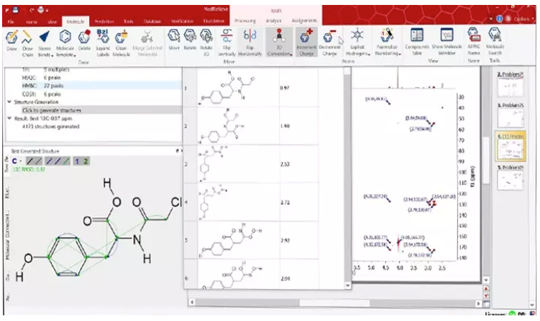 利用先进的计算机辅助结构解析(CASE,Computer-Assisted Structure Elucidation)技术,该工具有助于解析未知结构。Mnova Structure Elucidation插件集成了复杂的算法来解释核磁共振数据,提出可能的分子框架。它支持研究人员通过分析光谱数据和生成潜在的候选结构来揭示复杂的结构,确保彻底的阐明过程。