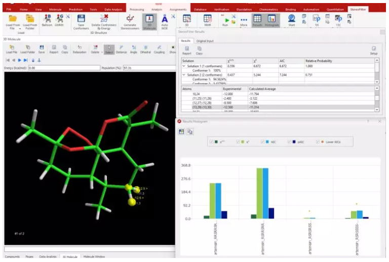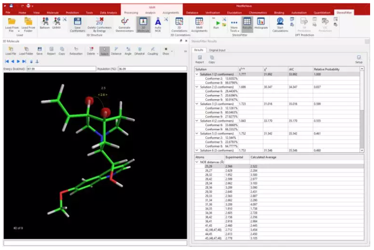 检查分子结构的动态方面,这个工具侧重于3D构象分析。通过利用NMR数据和计算方法,Mnova StereoFitter插件提供了分子在溶液中采用的构象的见解。了解这些构象及其动态行为有助于阐明分子的功能特性。